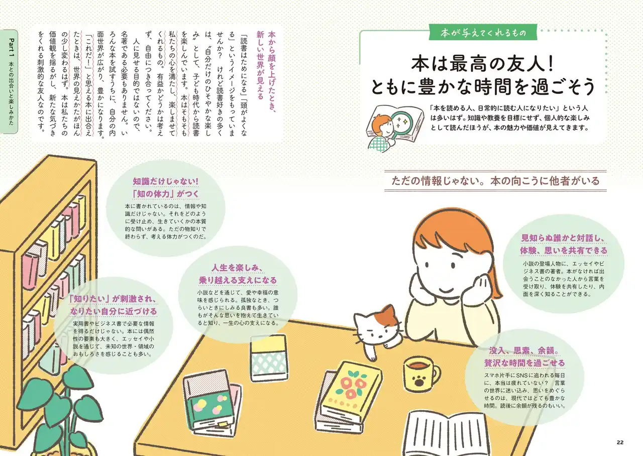 本を1冊読みきれない、学生のころ国語が苦手だったから本に苦手意識がある、まとまった時間が取れない、そもそも何を読んだらいいかわからない…、本書ではそんな人に向けて、本との出合い方、自分に合う本の見つけ方、堅苦しくない読み方などを楽しく紹介! さらに、本をテーマにした旅や、1冊の本が出来上がるまでの工程、本とかかわる仕事など、本をもっと自由に楽しむための情報も満載です。 |
