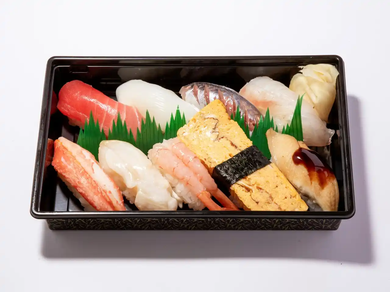 新潟県佐渡島の名産「佐渡コシヒカリ」をシャリに使用し、生の本マグロに佐渡名産のアジや南蛮 (甘エビ)、本ズワイガニ、新潟の白身魚を代表する真鯛など、こだわりをぎゅっと詰めた一折りです。 |