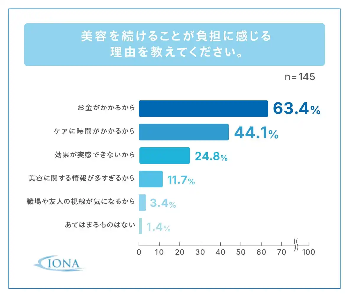 美容で「自分に満足できない」と感じる女性は約7割。美容を続けることが負担に感じる理由として、「効果が実感できない」「ケアに時間やお金がかかる」といった回答が目立ちました。 美容をしても「満足できない」と感じる女性が多く、心理的負担だけでなく、時間やコストの負担も美容疲れを助長していることが読み取れます。また、日常的なケアにストレスを感じている実態が浮き彫りになりました。 |