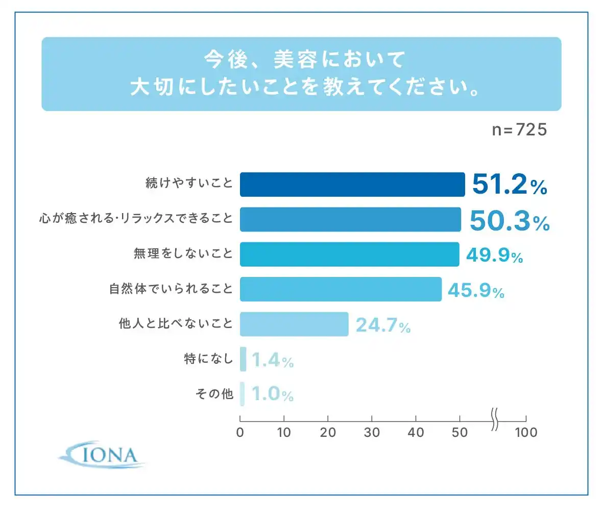 | 理想の美容としては「心や気分を整える時間」が半数以上で最多。今後大切にしたいことでは、「続けやすさ」「心が癒される・リラックス」「無理をしないこと」がほぼ半数を占めています。現代女性の美容価値観は、義務感のある“頑張る美容”から、自分を満たす“癒しの美容”へとシフトしていることがうかがえます。 | |||||||||