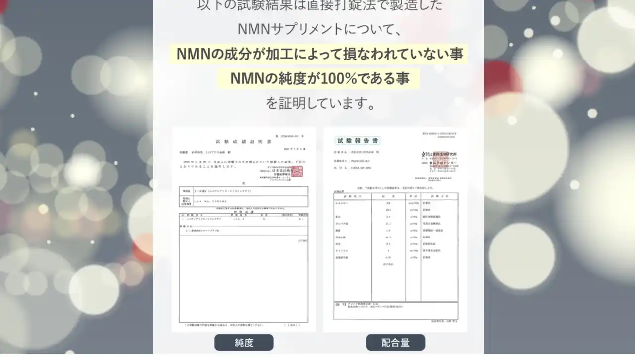 | 厚生労働省の認定機関によるNMNの純度試験の結果です。 | |||