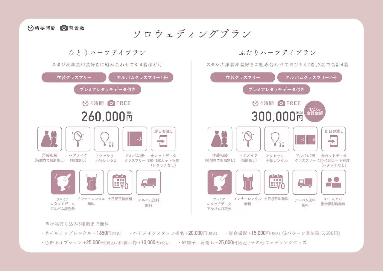 ハーフデイプランの最大の特徴は、着たい衣装数によって自由にプランニングができるところ。 |