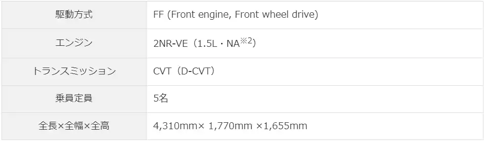 | 2NR-VEエンジン(1.5L)を搭載し、力強い走りを実現すると共に、DNGA Bセグメント用プラットフォーム、D-CVTを採用し、優れた車内の静粛性、燃費性能を実現 | |||