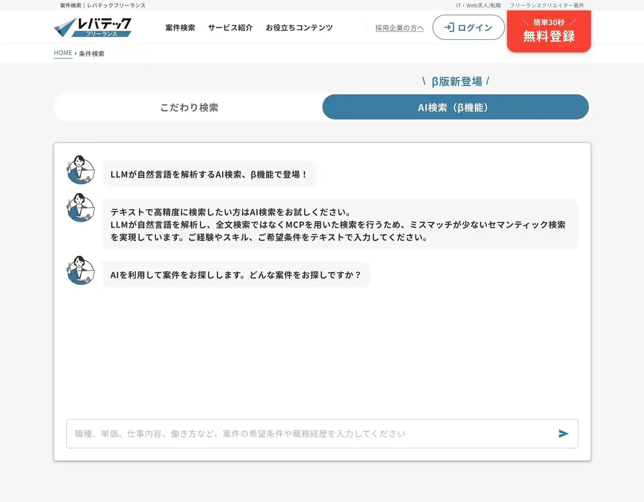 「日本を、IT先進国に。」をビジョンに掲げるレバテック株式会社( https://levtech.jp/ ) が運営するITフリーランス支援サービス「レバテックフリーランス」は、エンジニア一人ひとりの希望条件に応じた案件を会話形式で検索できる新機能「AIチャット案件検索(β版)」の提供を開始します。 |