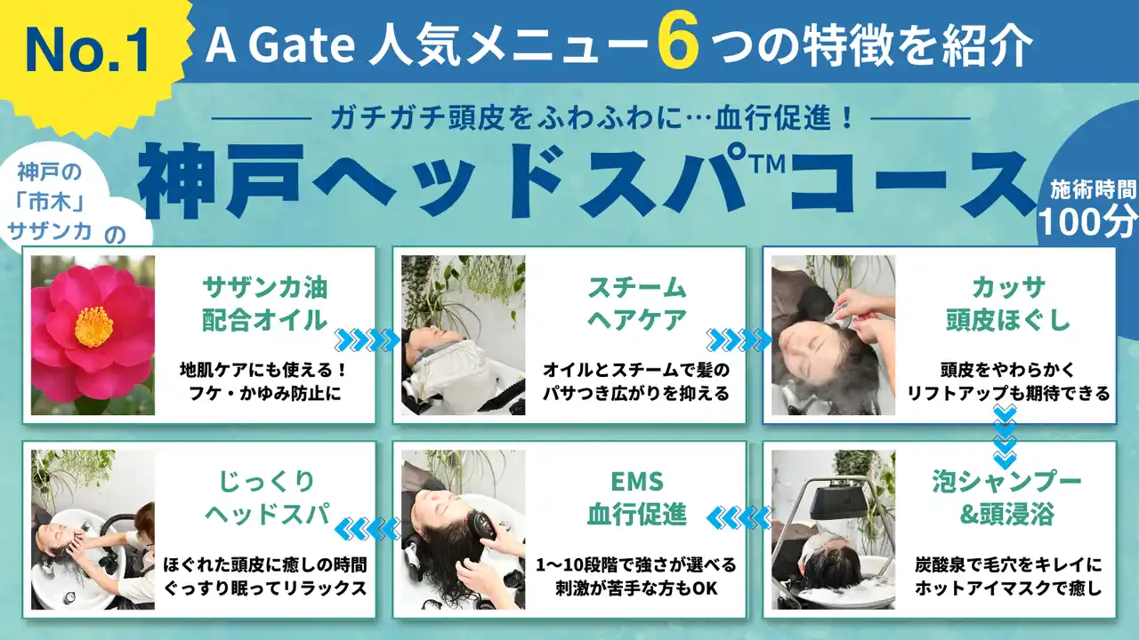 「A Gate ヘッドスパ専門店」の2周年を記念して誕生したメニューで、神戸市の「市民の木」(市木)である「サザンカ」の成分を含むオイルを使用した施術を行うことから『神戸ヘッドスパ(TM)コース』と命名しました。 |