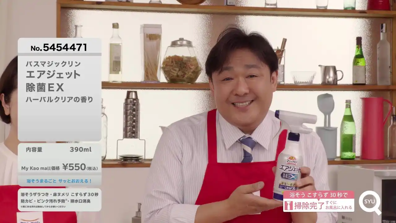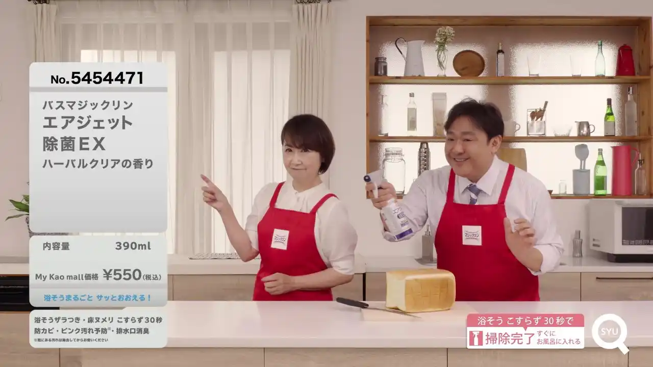 12月22日(月)19時より、花王マジックリン公式YouTubeチャンネルにて「ギコギコorゴシゴシしたら即終了!みんなでドキドキ!ショッピングLIVE」を配信します。配信にはWeb動画に出演した福島豊さんと石川小百合さんが再び登場し、「バスマジックリン エアジェット 除菌EX」を通販番組さながらのテンションで紹介します。 |