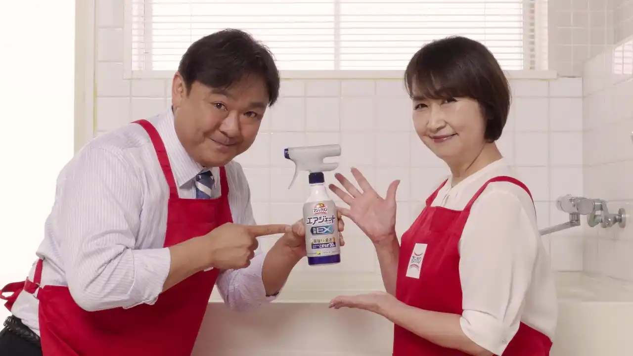本動画は、公開直後からSNS上で視聴者の反響を集め、話題となっています。Web動画には、実演販売士・福島豊さんとナレーター・石川小百合さんが出演。「ゴシゴシはしません」篇では、約1秒間、ミストが出続けて、広範囲をラクにおおえるスプレーの「シューーーーーーッ」という吐出音と、“こすらない掃除”の軽快さを取り入れ、「バスマジックリン エアジェット」シリーズの特長や使った瞬間の気持ちよさを感覚的に描いています。 |