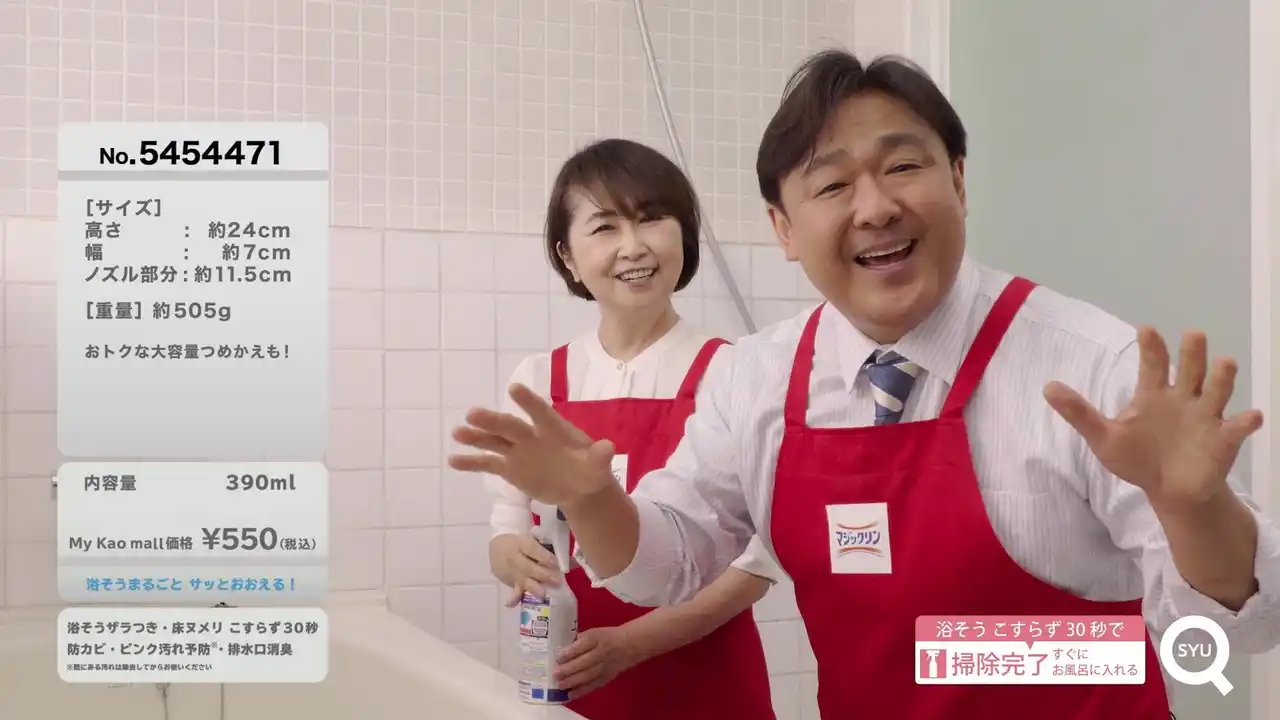 通販番組の世界観をそのまま再現し、福島さんと石川さんの軽快な掛け合いで「こすらずラクなお風呂掃除」を実演。寒さや1年の疲れでお風呂掃除がついおっくうに感じるこれからの季節にもぴったりな、「バスマジックリン エアジェット」シリーズの魅力を紹介する内容です。 |