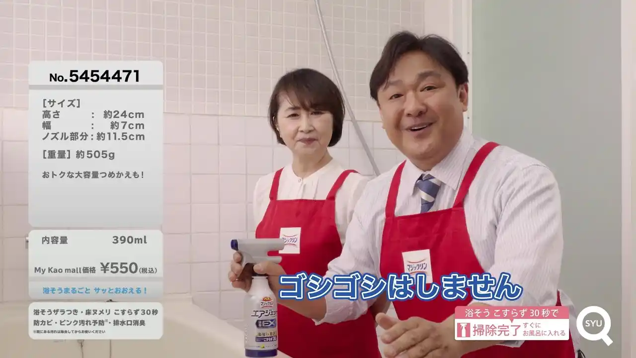 一方、「ゴシゴシはしません 通販番組」篇では、通販番組さながらのお二人のコミカルな掛け合いで「バスマジックリン エアジェット」シリーズを楽しく紹介します。忙しい毎日のお風呂掃除を「少しでもラクにしたい」という気持ちに寄り添いながら、ミストを「シューーーーーーッ」と吹きかけて30秒後に流すだけでキレイになる驚きをテンポよく表現しています。 |