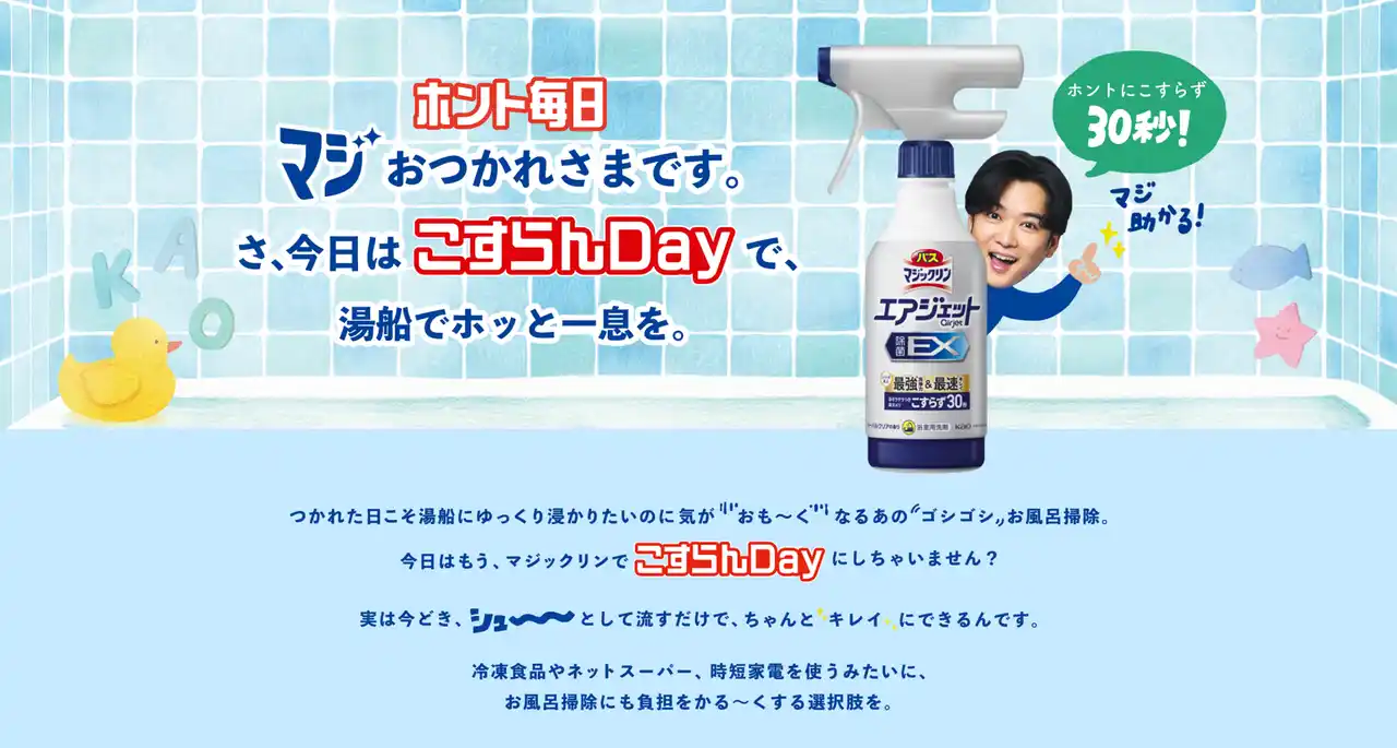 花王「マジックリン」は、湯船入浴が増える季節に、疲れている時でもお風呂掃除がネックにならないよう、“浴そうに一気にスプレーできて、こすらず30秒”でお風呂掃除が完了する「バスマジックリン エアジェット」シリーズの魅力をエンタメの力でより直感的に伝えるWeb動画を、2025年12月17日より花王マジックリン公式YouTubeチャンネルにて公開します。 |