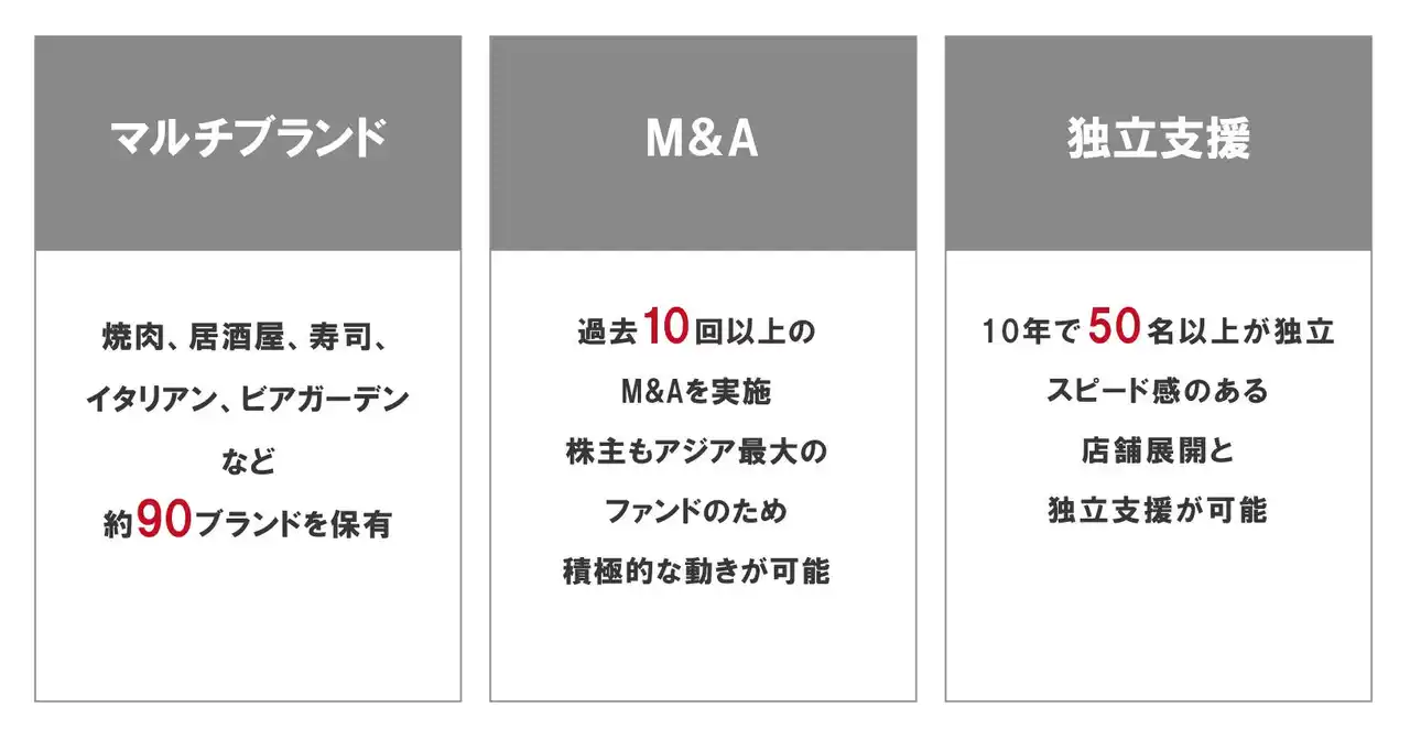 過去10件以上のM&A経験とアジア最大級のファンドPAGの資金力を有するGYRO HOLDINGSでは、今後も積極的にM&Aを検討していく考えです。そのため、「食で未来を創る」という当社の理念や考えに共感し、共に未来を切り拓ける可能性のある企業を常に募っております。引き続き、そば・うどん・とんかつ・焼肉・ハンバーグ・郊外型レストラン等、幅広いジャンルをグループに迎え入れ、日本の素晴らしい食を世界に届けられる飲食企業をグループ一丸となり目指してまいります。 |