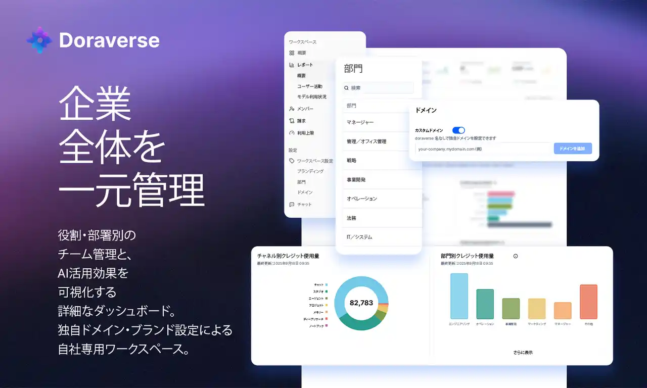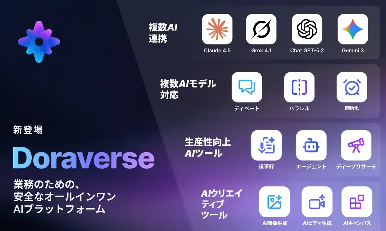 株式会社DORAVERSE JAPAN(本社:東京都台東区、代表取締役:近藤修康)は、企業内のAI活用を統合的に管理・最適化する法人向けオールインワンAIプラットフォーム「Doraverse(ドラバース)」の正式版となるバージョン1.0の提供を、2025年12月17日より開始いたしました。 |