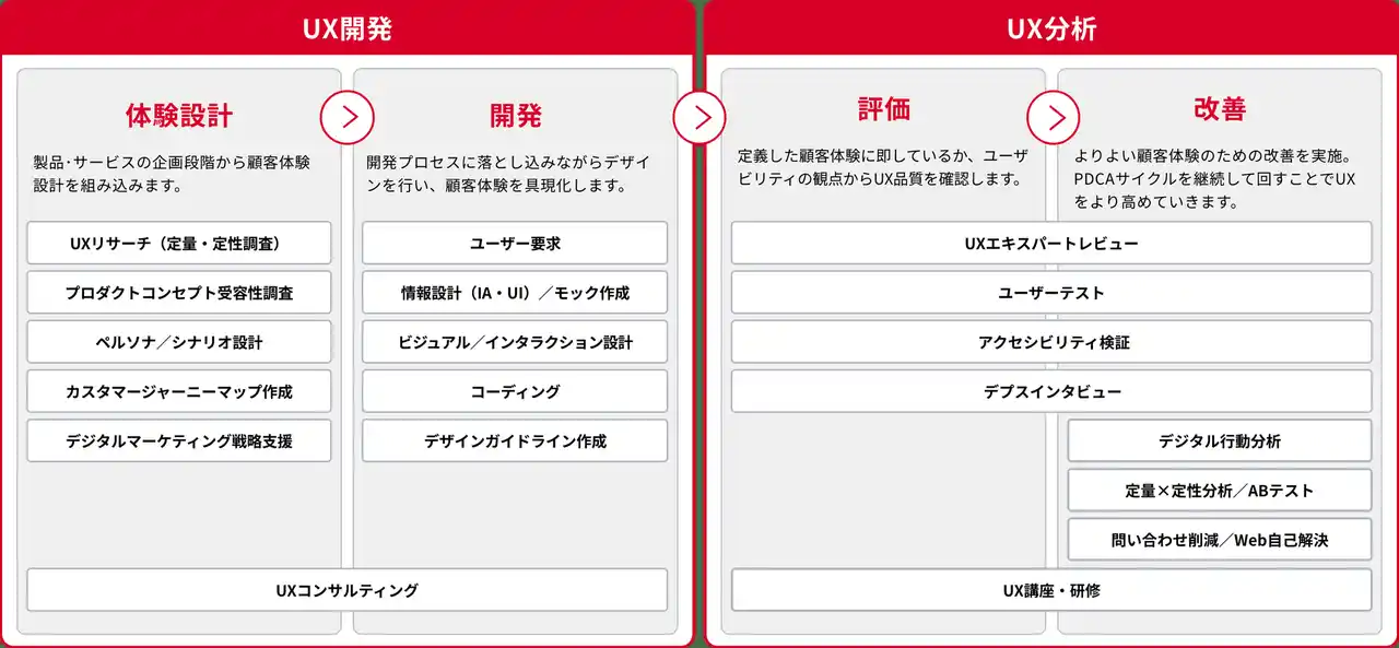 ソフトウェアの品質保証で培ったノウハウを活用し、ソフトウェア開発の企画段階からリリース後の改修まで、開発プロセスの上流から下流までをカバーするUXソリューションを展開。人間中心設計専門家をはじめとするUXのエキスパートが、製品・サービスの仕様や開発フェーズに応じて最適なユーザビリティのあり方、改善手法をご提案します。 |