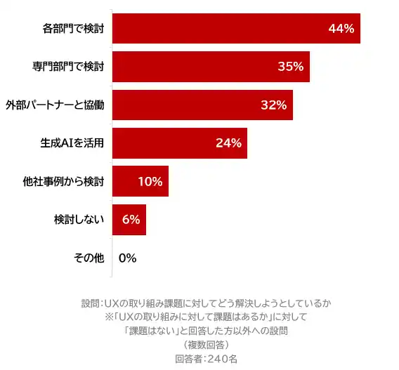 UXの取り組みに対して課題を感じている企業に、課題をどのように解決しようとしているか尋ねたところ、「各部門で対応策を検討」が44%と最多になりました。UX課題を特定部署・担当者だけに限定して対応するのではなく、全社課題と捉えて複数部門で協働しながら推進する傾向が出始めてきたことがわかります。 |