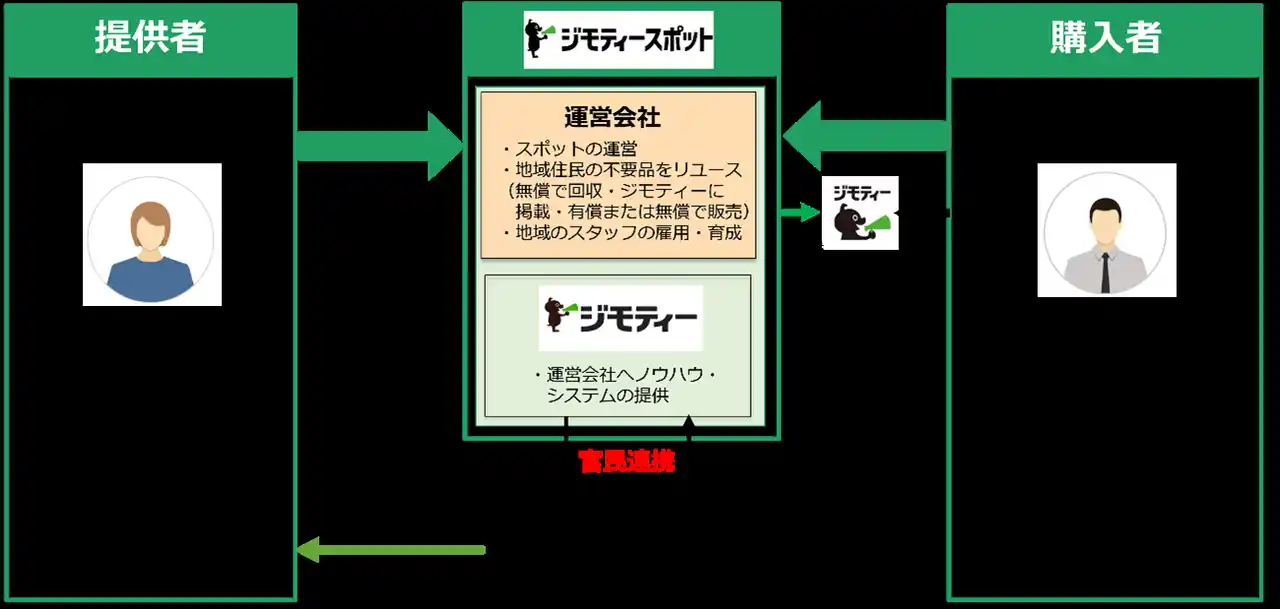 ジモティースポットは、「まだ使えるけれど不要になったモノ」を地域のコミュニティ内で譲り合うことが出来るサービスです。不要品を譲りたい方は予約なしで持ち込むだけで、次の必要とする人へつなぐことができます。譲り受けたい方は、地域の情報サイト「ジモティー」で商品情報を確認し、店舗で実物を見て購入・引き取りが可能です。 |