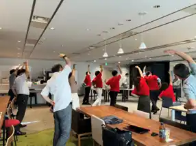 | 当社は、役職員によるフットサル部、ランニング部、ゴルフ部、野球部等のスポーツに関する部を設け、福利厚生の一環としてその活動を支援しております。また、オリジナル体操「いちごゆるふわ体操」を製作し、毎週社内で開催しているオンライン朝礼の開始前に流しております。さらに、所属スポーツ選手を含む社員一丸となって地域の綱引き大会へ出場したり、選手の国内大会出場時には、社員による応援観戦を実施することで、社内スポーツ活動の推進を図りました。 | ||||||||||