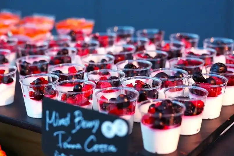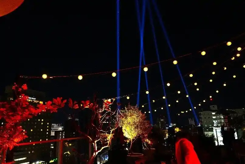 | テラスには照明演出にて、空に向かい5本のサーチライトを照らし、また、デザートBARを設置して広島の夜景と共にスイーツをお楽しみいただきました。 | |||||||||||