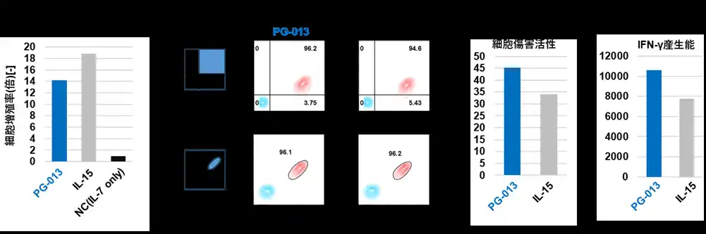 その結果、PG-013はIL-15と同様の高い細胞増殖(>12倍)を誘導し、同様の表面マーカーを有するNKT細胞を得ることができました。また、細胞傷害活性においても、PG-013はIL-15と同等またはそれ以上の活性を示しました。 |