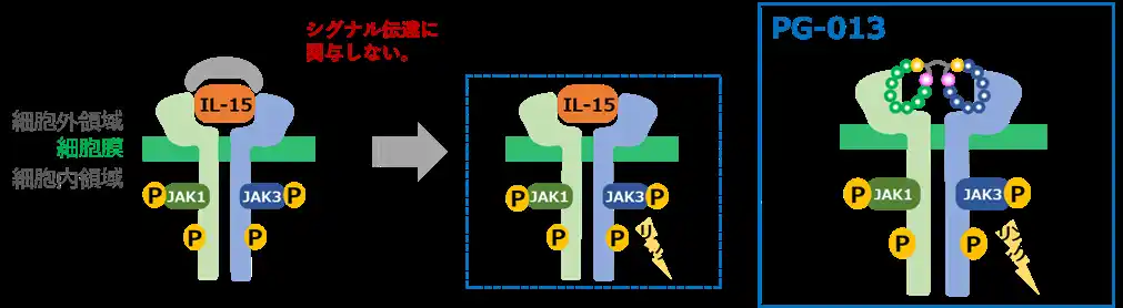 IL-15代替ペプチド(PG-013)は、IL-2Rβおよび共通γ鎖(γc)にそれぞれ選択的に結合する2種類の環状ペプチドで構成されるヘテロダイマーペプチドです。IL-15と同様にIL-2Rβとγcのダイマー化を誘導することで、IL-15様の活性を示します(下図)。 |