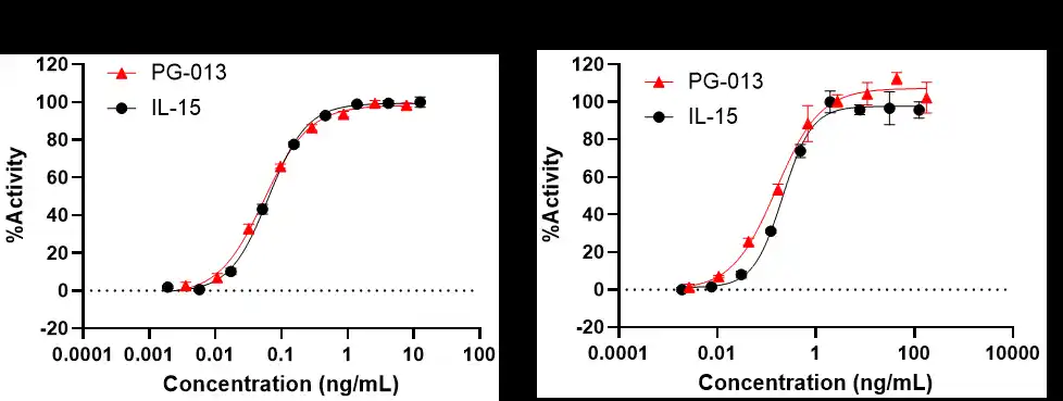 PG-013と市販されているリコンビナントIL-15の機能比較試験を、レポーターアッセイ(JAK1/3-STAT5シグナル経路)およびヒト由来NK細胞株KHYG-1細胞の増殖試験によって行いました。その結果、PG-013は、IL-15と同様のレポーター遺伝子の活性化能(上左図)ならびにKHYG-1細胞の増殖活性(上右図)を示しました。 |