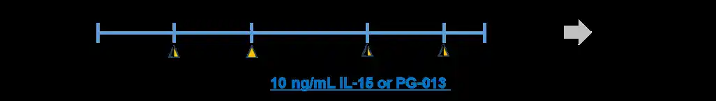 PG-013の更なる機能評価として、未成熟NKT細胞の成熟過程における培養系でIL-15との比較を行いました。以下のプロトコルに従い、未成熟NKT細胞を解凍・起眠後、IL-15またはPG-013を添加した培地で10日間培養し、得られた成熟NKT細胞の増殖、表面マーカー発現、機能性を評価しました。 |