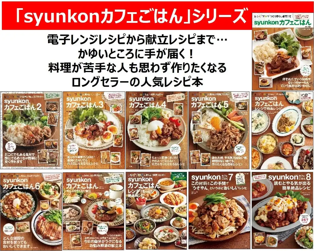 カフェごはん(2~8)』『syunkonカフェごはん レンジで絶品レシピ』『syunkonカフェごはん めんどくさくない献立』『syunkonカフェごはん レンジでもっと! 絶品レシピ』とシリーズ化され、累計780万部を超える。 |