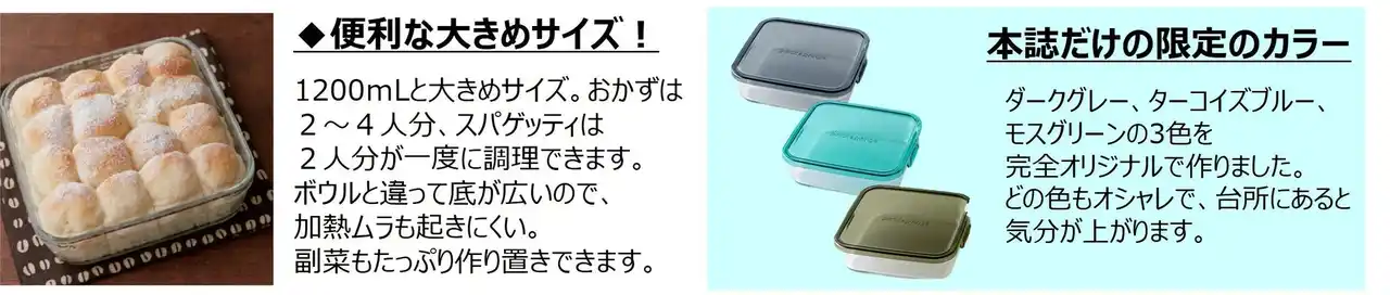 本誌は、2021年に刊行し大ベストセラーとなった『山本ゆりのおいしいレシピ BOOK限定カラーのiwaki耐熱容器つき!』から4年ぶりとなる待望の新作です。今回も山本さん愛用のiwakiの耐熱調理容器「パック&レンジ」がついています。本誌だけの限定カラーはダークグレー、ターコイズブルー、モスグリーンの3色です。「パック&レンジ」を使って作る掲載レシピはすべて新作。人が集まったときの華やかなおかずから毎日の副菜、パスタ、大人気スイーツ、ちぎりパンまで31レシピを紹介しています。 |