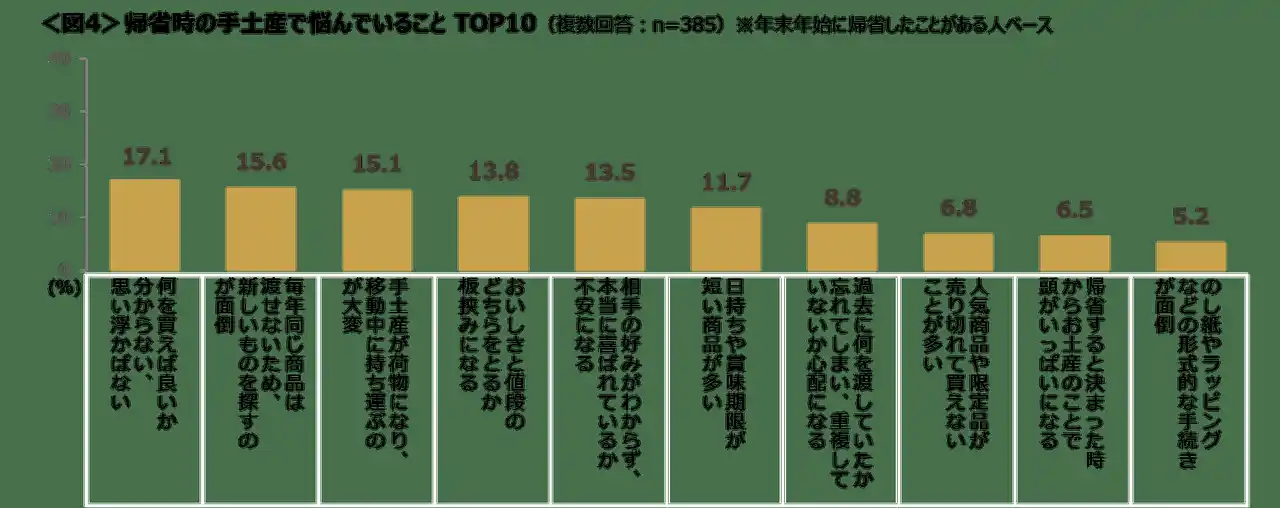 | 帰省時の手土産の悩みは、「何を買えばよいか分からない、思い浮かばない」「毎年同じ商品は渡せないため、新しいものを探すのが面倒」「手土産が荷物になり、移動中に持ち運ぶのが大変」「おいしさと値段のどちらをとるか板挟みになる」「相手の好みがわからず、本当に喜ばれているか不安になる」が上位。<図4> | |||