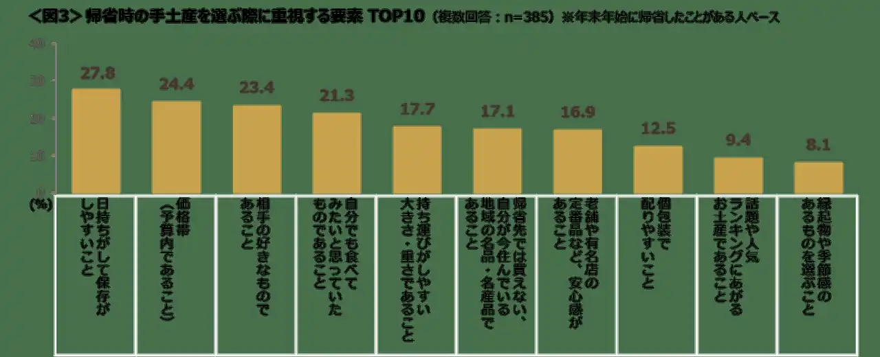 | 帰省時の手土産を選ぶ際に重視するのは、「日持ちがして保存がしやすいこと」(27.8%)が「価格帯」(24.4%)を上回りトップ。 | |||