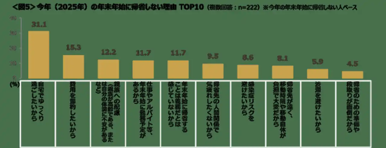 | 今年の年末年始に帰省しない理由は、「自宅でゆっくり過ごしたいから」が31.1%と高く、休息を優先させたい意向が強い。<図5> | |||