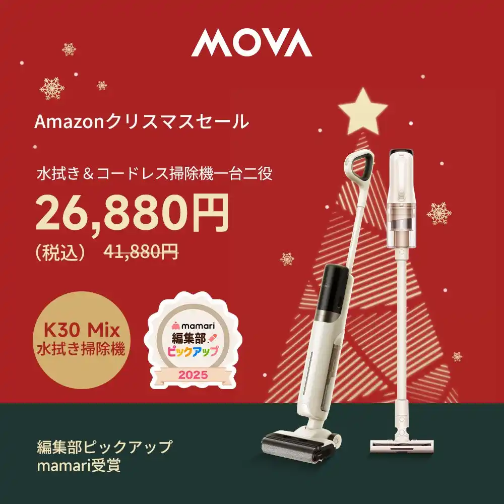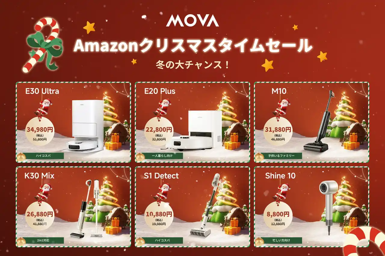 スマート家電のリーディングカンパニーであるMOVAの日本法人、Spacewalker Technology Japan株式会社は、12月16日(火)9:00~12月25日(木)23:59まで開催される「Amazonクリスマスタイムセール」において、MOVAの人気アイテムを最大51%OFFの特別価格で販売いたします。今回のセール対象製品は、ロボット掃除機、水拭き掃除機、コードレス掃除機など多岐にわたります。 |