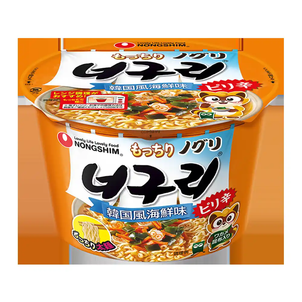 ノグリはコシのある太麺で、もちもちとした食感とうどんのような食べ応えが特徴的な海鮮ベースのラーメン。「ノグリ」は韓国語で「たぬき」のことで、丸くて太い麺の形がたぬきを連想させるということで名付けられました。実は辛ラーメンよりも長い歴史を誇るロングセラー製品で、辛いながらもスッキリとした味の「ノグリラーメン」や、辛さ抑えめの「ノグリラーメン マイルド」をはじめとした複数のラインナップを展開しています。 |