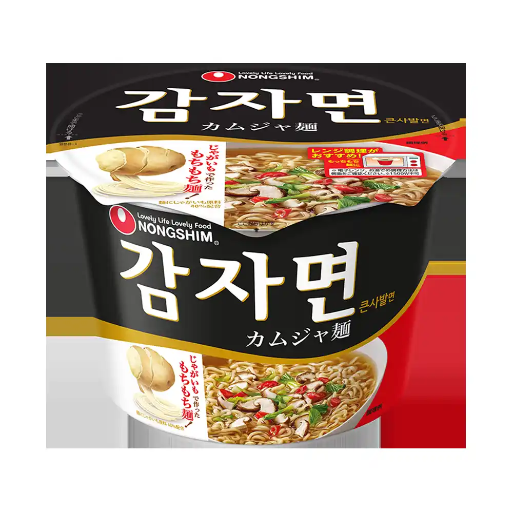 じゃがいも由来のもちもち食感の麺と、こしょうがアクセントのピリ辛スープが特長の「カムジャ(韓国語で“じゃがいも”)麺」。麺の40%がじゃがいも成分でできており、そのもちもちとした食感とつるつるしたのど越し、そしてあっさりとした旨味で辛さ控えめのスープが、韓国ラーメン初心者にもおすすめ。同製品の袋麺タイプは、農心ジャパン全製品の中でも毎年売上TOP10に入るほどの人気製品です(農心ジャパン製品売上食数実績 [2022-2024年]) |