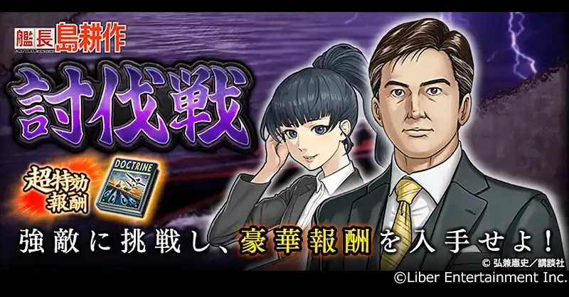 | コラボ限定のオリジナルシナリオで展開するイベント「討伐戦」が開催されます。本イベントでは、プレイヤーを待ち受ける敵艦隊を撃破することで、コラボクルー「★6 社長 島耕作」「★5 秘書 朱眞弥生」などの報酬が獲得できます。 | |||||||||