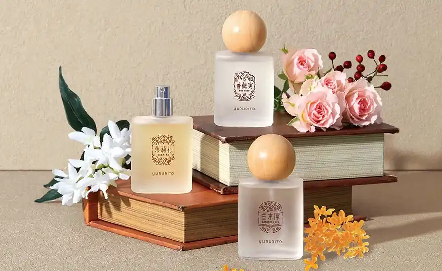 左から ゆるりと茉莉花オードパルファム、ゆるりと薔薇実オードパルファム、ゆるりと金木犀オードパルファム |