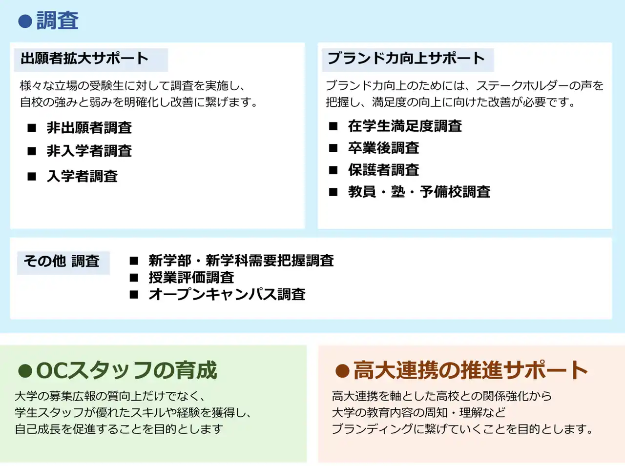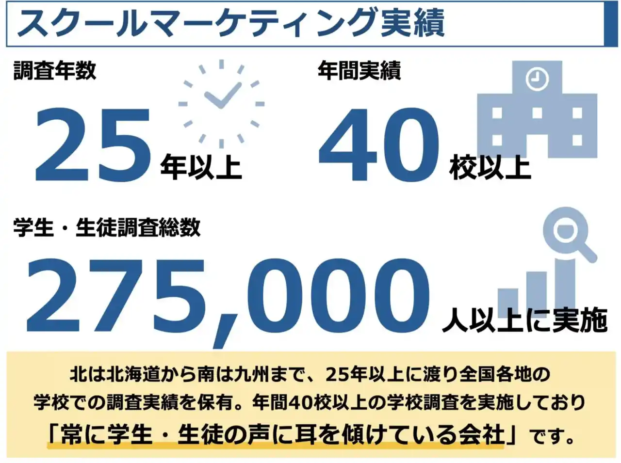 「スクール」分野では25年以上の実績を有しています。これまでに年間40校以上、累計275,000名以上の生徒・学生を対象とした調査を実施してきました。 |
