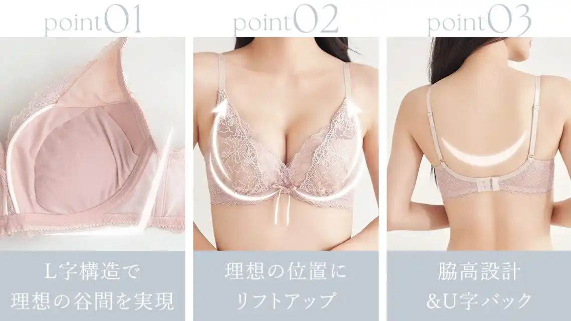 L字構造でバストをしっかり引き寄せて、自然で綺麗な谷間を作ることができます。 |