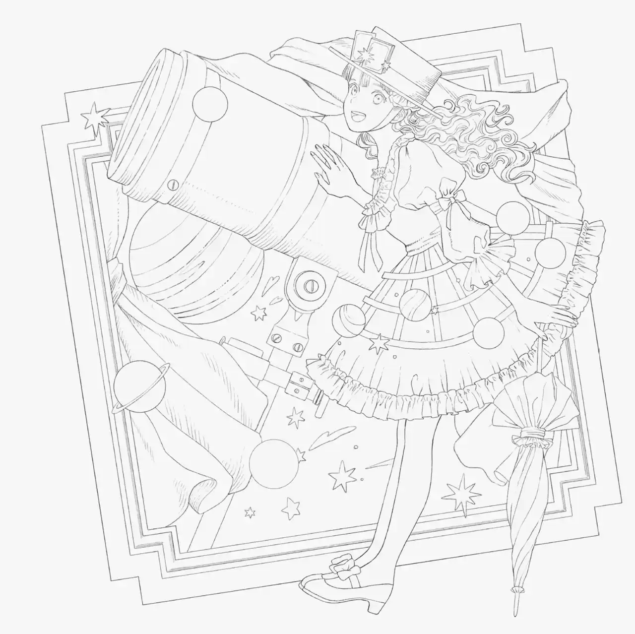 黒イ森さんによるぬり絵ブックの第1弾は、ヴィクトリアン・ファンタジーの世界と少女たちをテーマにした『ヴィクトリアン幻想図鑑 黒イ森ぬり絵ブック』。美しい鉱石や夜空に煌めく星座をモチーフにした絵柄や、スチームパンクの余韻を感じさせる部屋や優雅な衣装など、31点の絵柄を掲載しています。ご好評いただき、現在5刷目となっています。ぜひ、新刊と併せてお楽しみください。 |