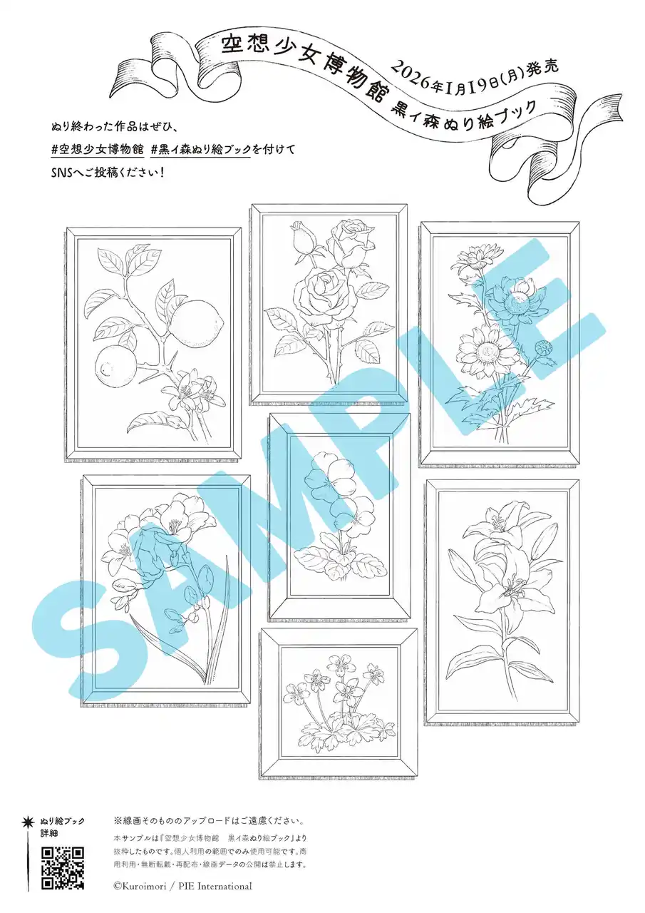新刊発売を記念して、『空想少女博物館 黒イ森ぬり絵ブック』の中身を事前にお楽しみいただけるサンプルを2種類公開中です。全国のコンビニ(セブンイレブン)にてネットプリント可能ですので、ご興味のある方はぜひお楽しみください。ぬり絵作品のSNS投稿ももちろんOK! 完成作品はぜひ、「#空想少女博物館」「#黒イ森ぬり絵ブック」のハッシュタグと共にご投稿ください。 |