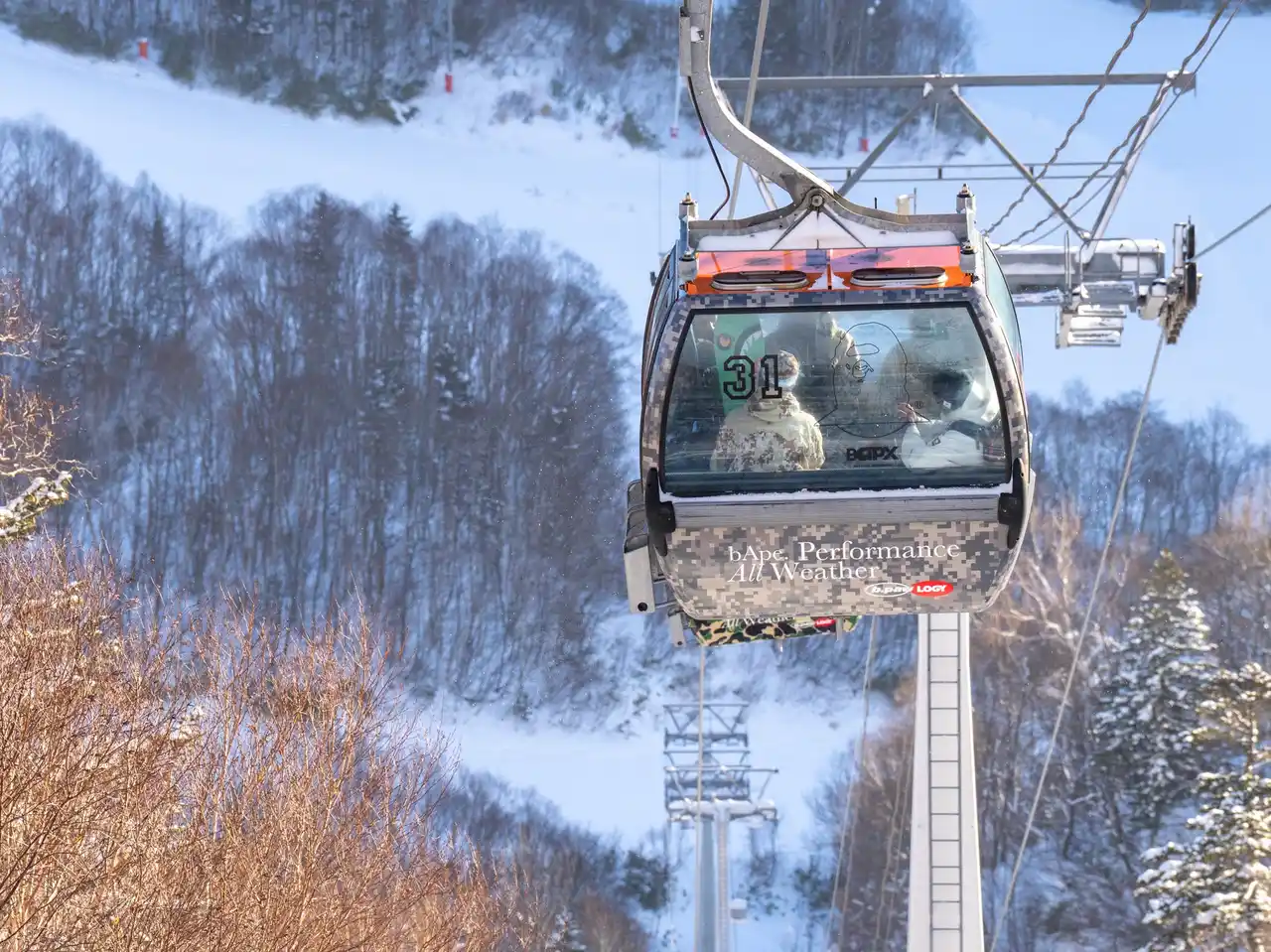 山麓から山頂へと向かうゴンドラには、今回のコレクションのビジュアルで全面ラッピングが施された特別仕様のキャビンが登場。 |