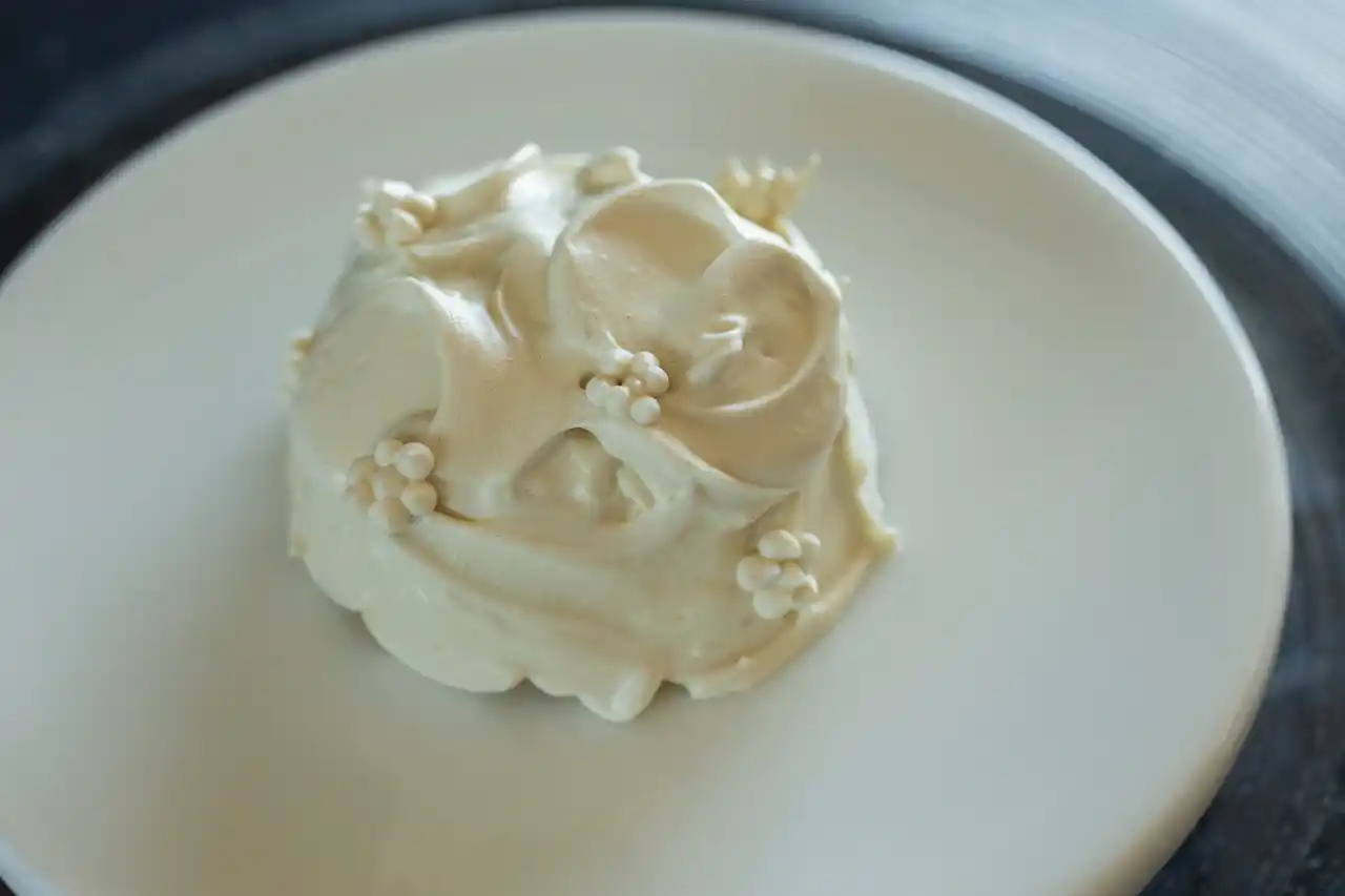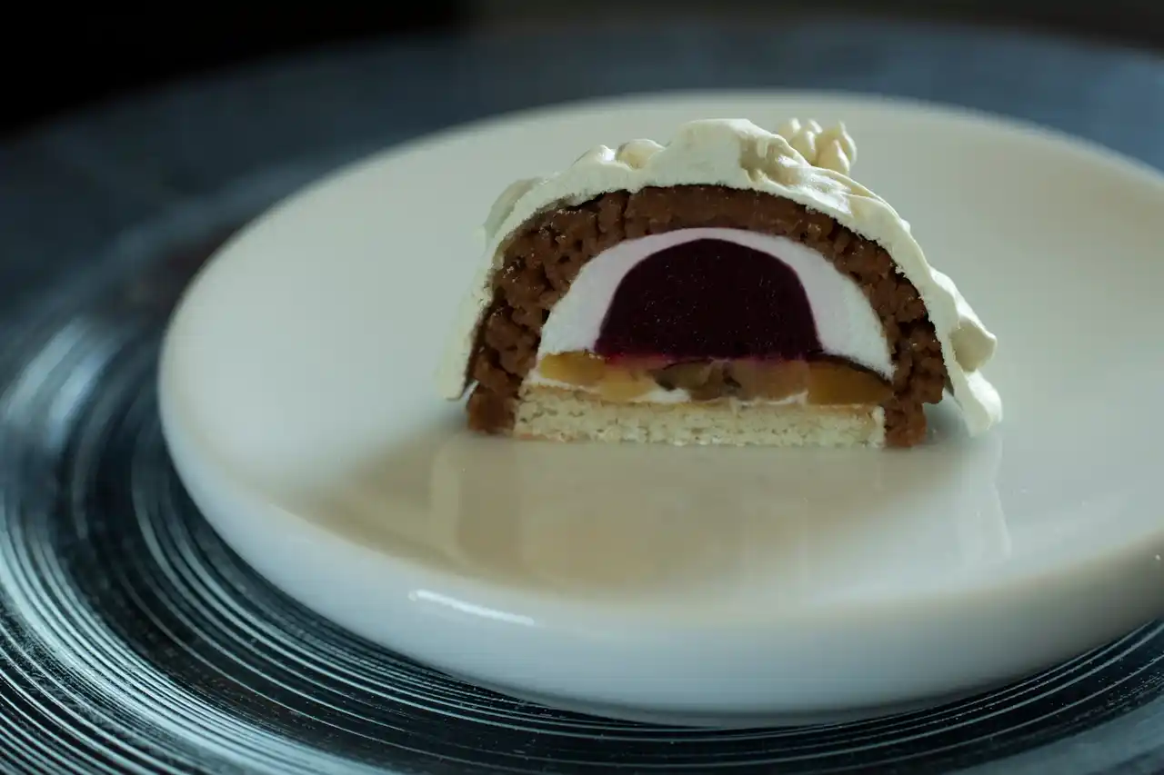 プランシグネチャースイーツは、HANROの世界観を表現したメレンゲクッキーです。メレンゲクッキーの中には、モンブランが入っており、ラムシロップ入りクレームマロン、クレームシャンティ、クレームカシス、ビスキュイダコワーズなどの多様な味わい、カシスの酸味とメレンゲの甘さの調和などをお楽しみいただけます。 |