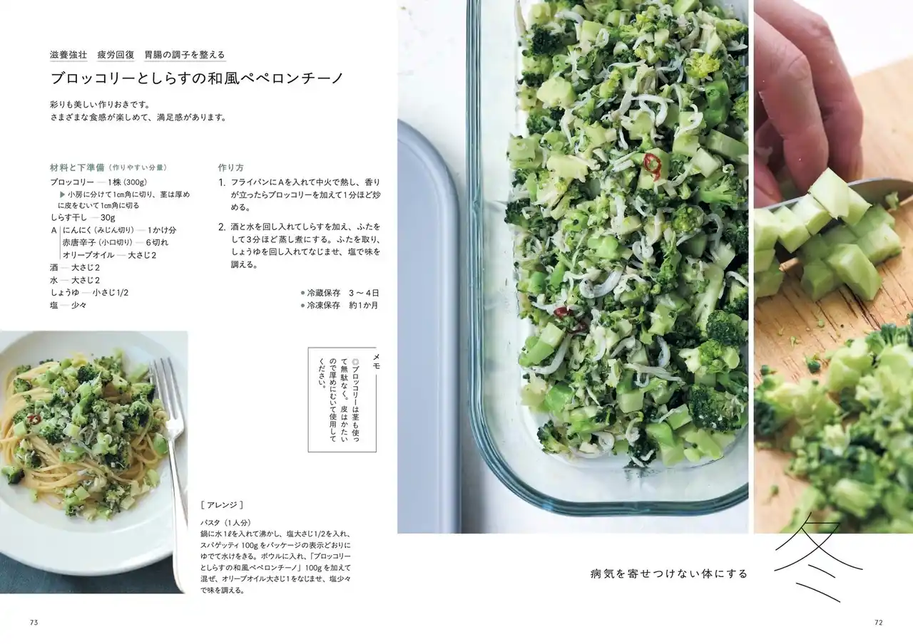 まずは1品でもいいので作ってみてください。最初からたくさん作る必要はありません。少し余裕があるときに、「とりあえずなにか作ってみようかな」というくらいの感覚で、軽やかに考えてほしいのです。その1品さえあれば、あとは肉や魚をさっと焼くだけでも、食卓がぐんと豊かになります。作っておけば未来の自分が助かる。「作りおき」のありがたさを、あなたはそのとき実感できるはずです。 |
