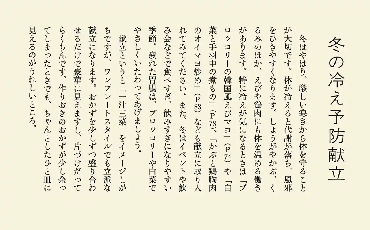 食べることは、毎日のことで、一生続くこと。だからこそ、体によいものを上手に取り入れていきたいものです。とはいえ薬膳には薬ほどの劇的な効果はありませんから、できるだけ長く続けてほしいと思います。続けることで少しずつ、無理なく、体調・体質を改善させることができるのが薬膳なんですよね。だからこそ本書は、「忙しくてもこれなら続けられる」と思ってもらえるようなレシピ集を目指しました。日々の生活に追われるみなさんが、心身ともに健やかであり続けられるよう、一年を通して本書を活用していただければと思います。(「はじめに」より)