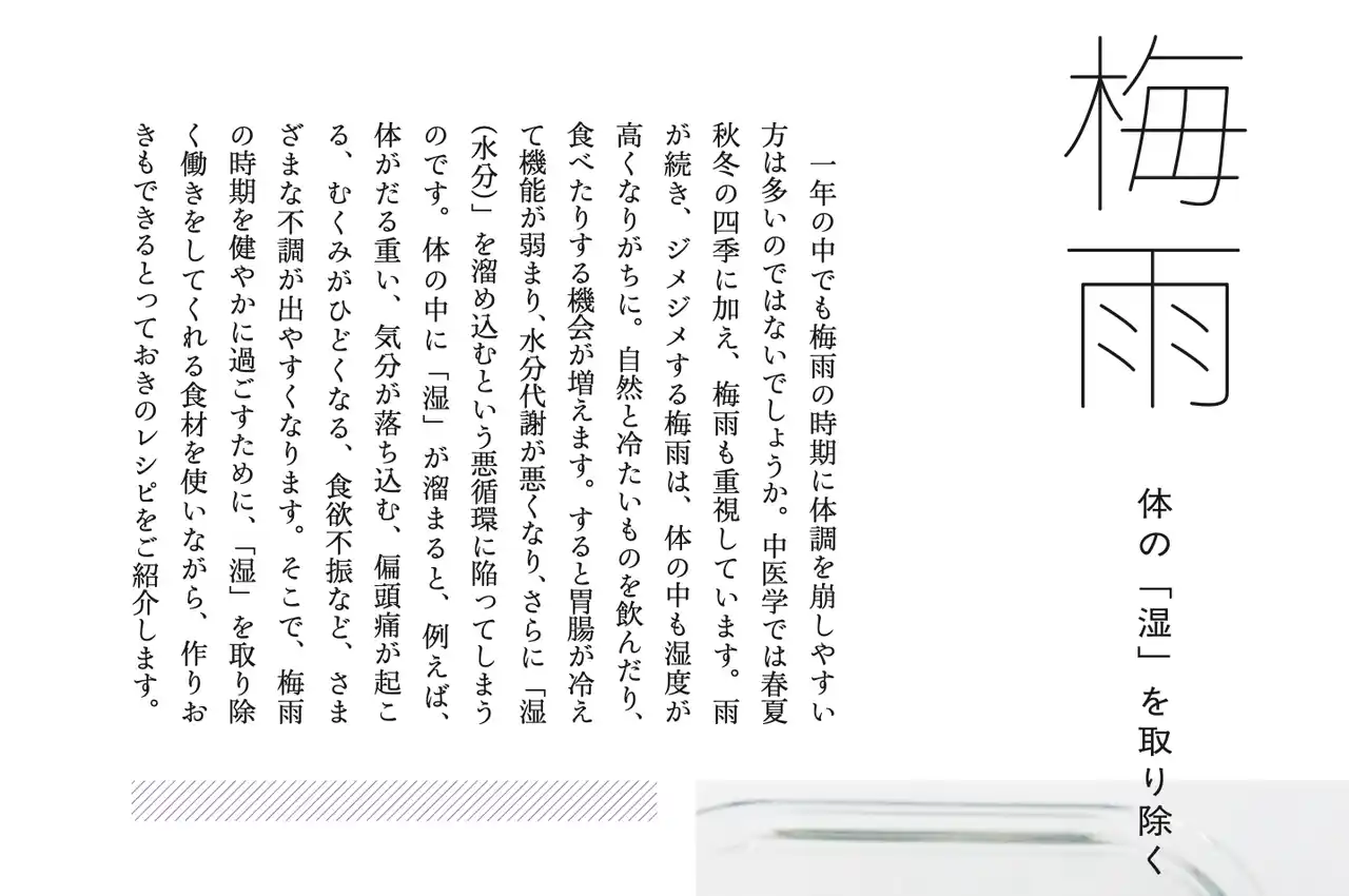 私は、2016年に国際中医薬膳師の資格を取得し、料理の仕事をしていく中で、薬膳への理解を深めてきました。「薬膳」というと身構えてしまう方もいらっしゃるかもしれませんが、実はそんなに難しいことはありません。たしかに本格的な薬膳は、私たちにはあまりなじみのない食材を使うこともありますが、本書のレシピは、いつものスーパーマーケットで購入するような、いつもの食材で問題ありません。忙しい日々の中でも作れるよう、材料も工程も極力シンプルにして、最大限においしく仕上がるよう、これまでの経験を活かしつつ、工夫を凝らしました。