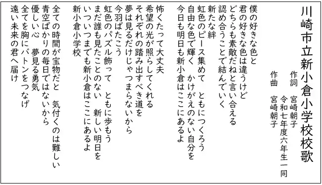 ・6年生児童が校内の全児童に呼び掛けながら「校歌に入れたい言葉」について検討。児童たちが新小倉小学校の教育目標「新しい自分をつくる 未来をつくる」などに沿い、今のこと、未来のことなどの視点で言葉を8つ選ぶ。 【児童みんなで選んだ校歌に入れたい言葉(8つ)】 ・新小倉 ・虹色(の)パズル ・自分をつくる ・新たな絆 ・未来をつくる ・ともに歩む ・虹色(の)ピース ・バトンを繋ぐ |