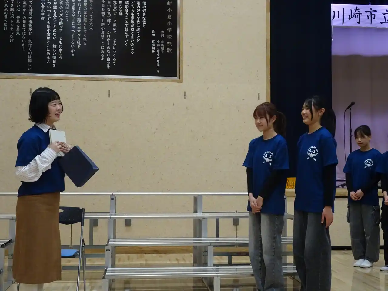 新小倉小学校では、児童の発案により、川崎市出身の3ピースロックバンド「SHISHAMO」のGt.Vo 宮崎朝子(みやざき あさこ)さんとともに校歌を制作する取り組みが進められてきました。児童が考えた「校歌に入れたい言葉」をもとに、宮崎さんが作詞・作曲を担当し、児童による練習を経て、式典当日において、出席した512名の児童たちにより校歌が初披露されました。 |