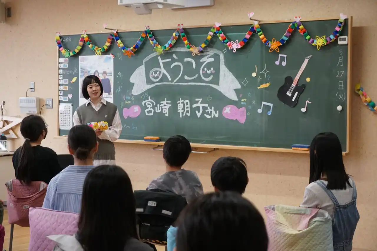 ・宮崎さんを学校に招き、児童との交流会を開催。 ・6年生児童から、これまでの経緯を説明し、宮崎さんから正式な快諾をいただく。 6年生児童「校歌に入れる言葉をみんなで検討して宮崎さんに届けたい」 宮崎さん「一緒にステキな校歌つくりましょう。」 |