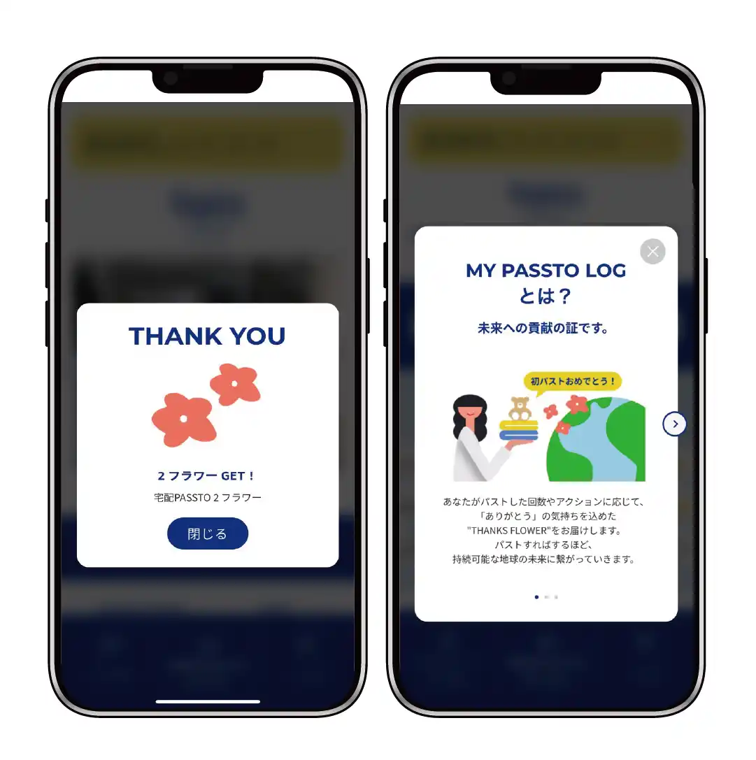 「MY PASSTO LOG」は、「宅配PASSTO」を利用して不要品を手放した回数やアクションに応じて、感謝の気持ちを込めた「Thanks Flower (サンクスフラワー)」が付与される機能です。一人ひとりのアクションが、意識をしなくても自然と地球のより良い未来につながっていることを可視化し、捨てない社会につなげます。 |