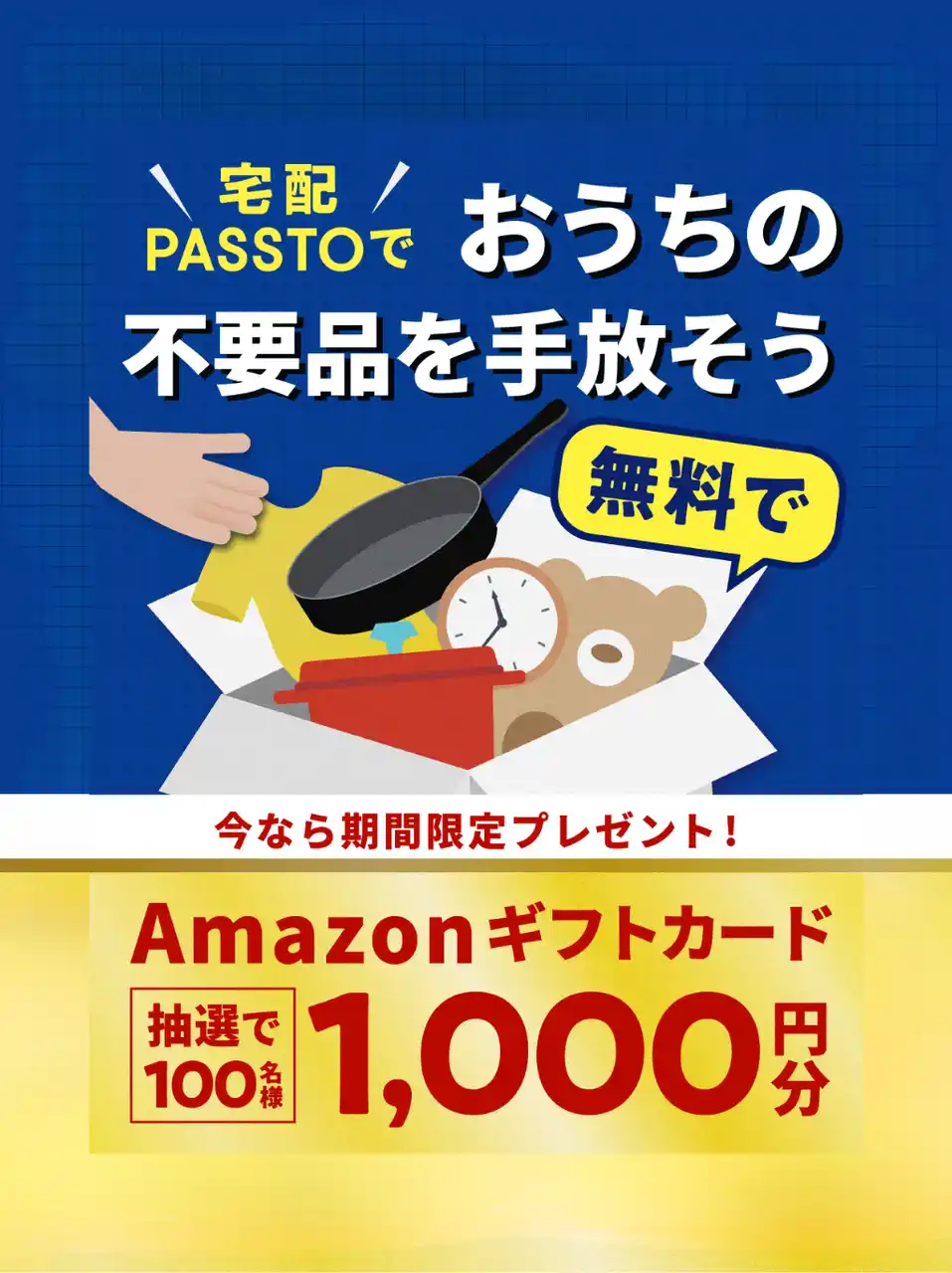年末おそうじキャンペーンの期間中にPASSTO公式LINEから「宅配PASSTO」で不要品を手放してくださった方に、 抽選100名様にAmazonギフトカード1,000円分をプレゼントいたします。 |