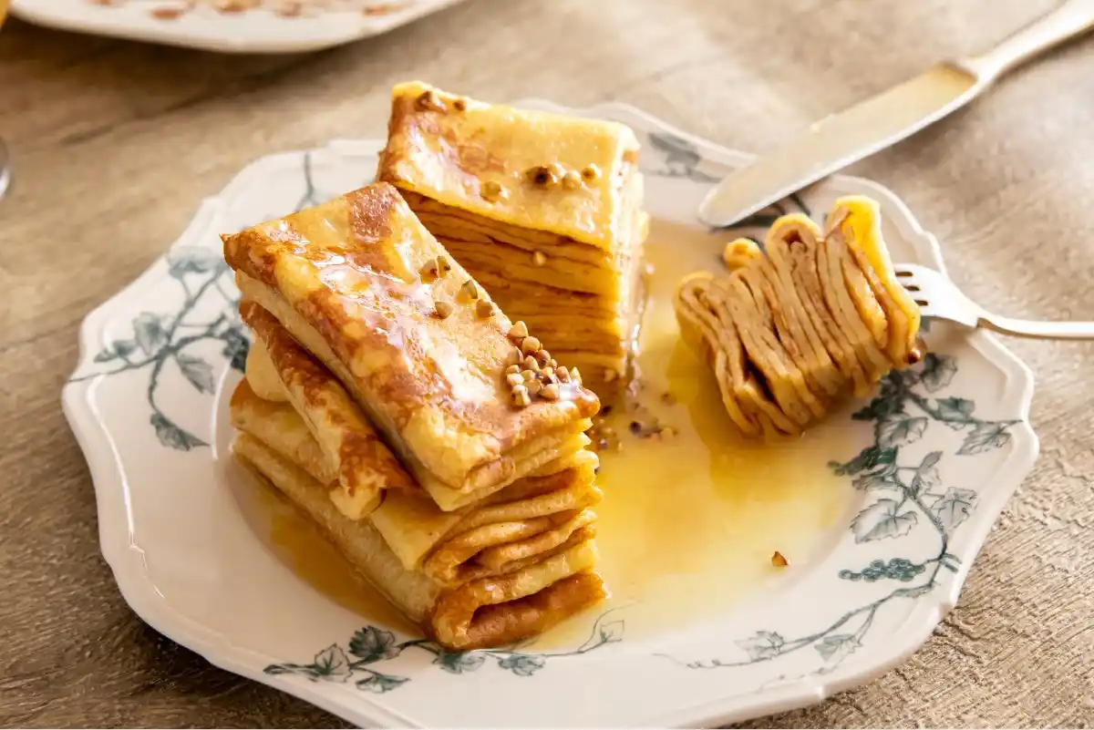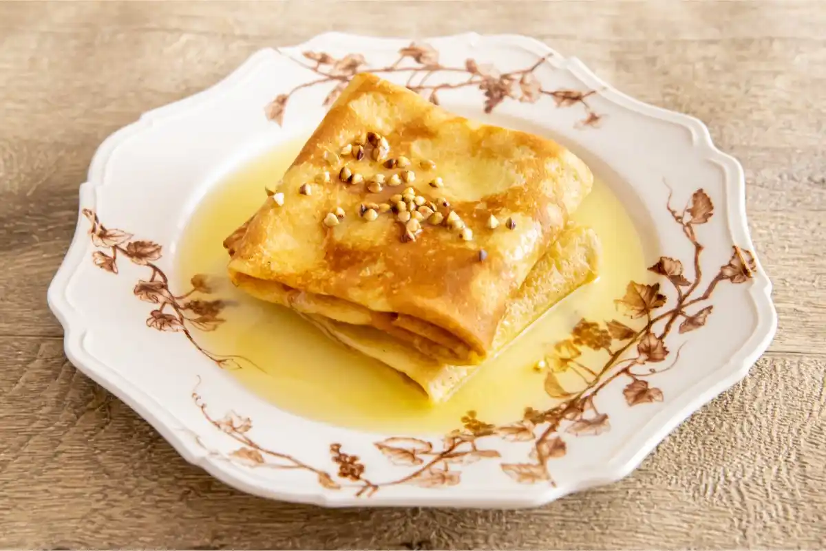 もちもち食感の生地にたっぷりのバターと蜂蜜がじゅわっと染み込む香り高いシュガーバタークレープ。食感のアクセントに蕎麦の実を添えて。 |